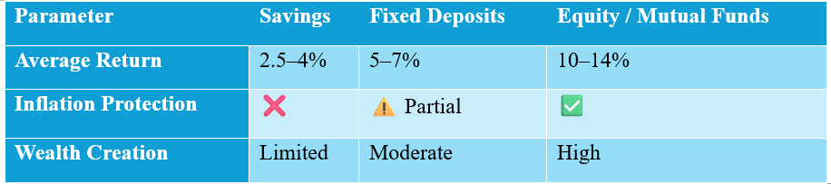 Savings instruments are designed for protection, not progression. Their primary objective is capital preservation, often at the expense of growth. Stability is their strength—but stability alone cannot fund long-term goals such as retirement, healthcare, or financial independence.